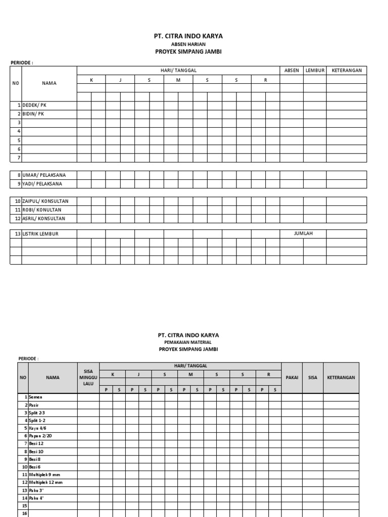 Contoh Absensi Proyek from reader021.docslide.net Maybe you would like to learn more about one of these? Check spelling or type a new query. We did not find results for: Contoh form absensi tukang bangunan.