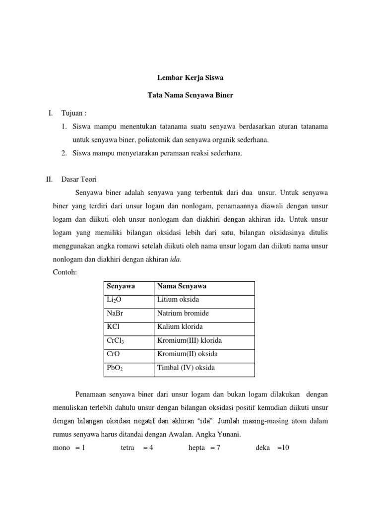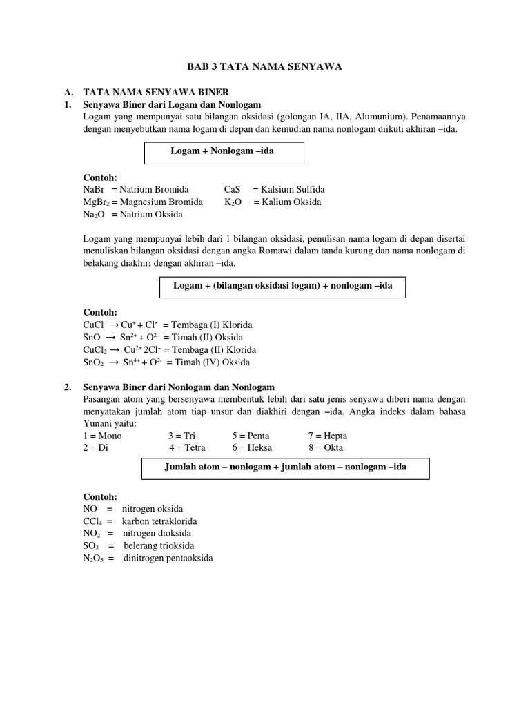 Oleh karena itu sebelum menentukan nama senyawa ini, kita terlebih dahulu harus mengetahui kation dan anion senyawa tersebut. Tata nama senyawa anorganik lengkap. Penamaannya dengan menyebutkan nama logam di depan dan kemudian nama non logam diikuti akhiran ?ida. Senyawa biner dari logam dan non logam. Tata nama senyawa sederhana tata nama senyawa disusun berdasarkan aturan iupac (international union of pure and applied chemistry).